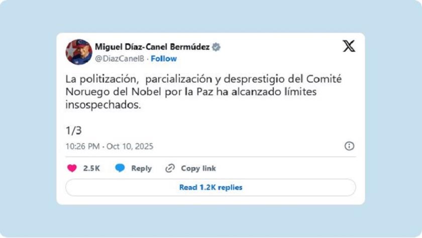 الصورة العامة) في منشور له على منصة "إكس"، عبّر الرئيس الكوبي عن استيائه من منح الجائزة لـ ماتشادو، قائلاً: "من المخزي أن تُمنح هذه الجائزة لمن دعت إلى تدخل عسكري في بلادها، وحرّضت على احتجاجات أدت إلى حرق الناس أحياءً".