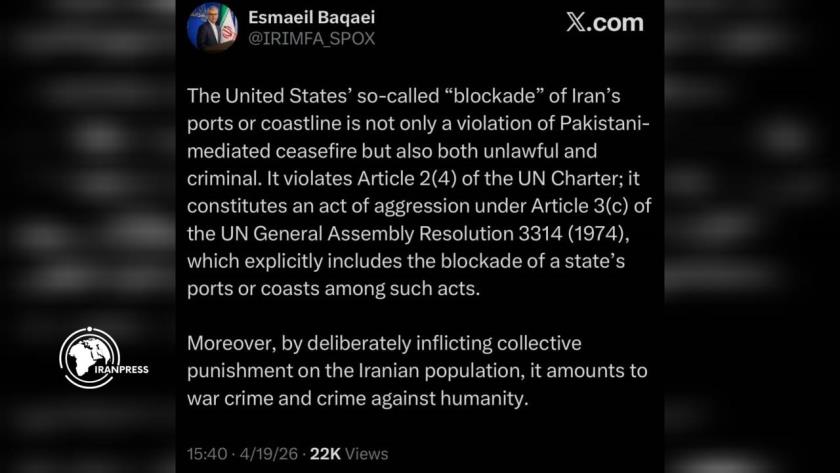 إيران برس - إيران: وأفادت وكالة إيران برس للأنباء نقلا عن منشور كتبه إسماعيل بقائي، المتحدث باسم وزارة الخارجية الإيرانية، ردًا على الحصار البحري الأمريكي لإيران عبر منصة إكس: إنّ الإجراء الأمريكي بحصار موانئ أو سواحل إيران ليس انتهاكًا لوقف إطلاق النار الذي توسطت فيه باكستان فحسب، بل هو أيضًا غير قانوني وجنائي تمامًا.