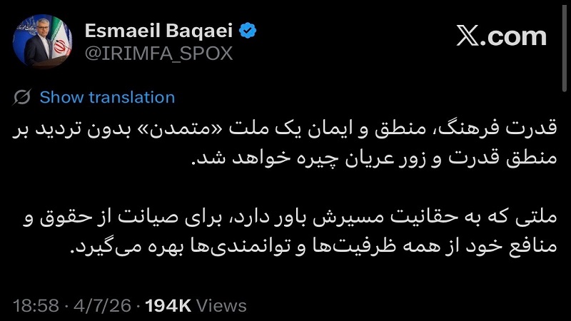 قال المتحدث باسم وزارة الخارجية الإيرانية إسماعيل بقائي إن الشعب الذي يؤمن بمساره المحق سيستعين بكافة الإمكانيات والقدرات للحفاظ على حقوقه ومصالحه.