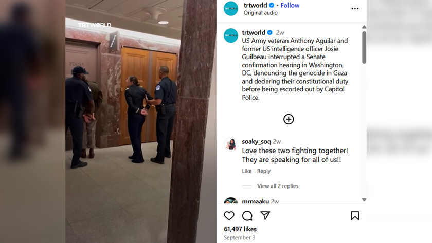 تداول ناشطون على منصات التواصل الاجتماعي مقطع فيديو يُزعم أنه يوثق لحظة اعتقال طيارين أمريكيين داخل مبنى البنتاغون بعد رفضهما تنفيذ أوامر عسكرية بنقل أسلحة إلى إسرائيل، لكن التحقيقات كشفت أن الفيديو يعود إلى حادثة داخل مجلس الشيوخ الأمريكي.