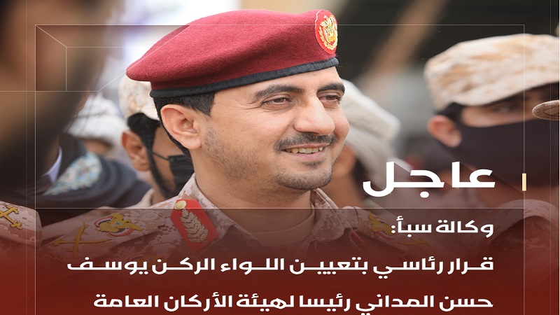 أصدر رئيس المجلس السياسي الأعلى في اليمن قرارًا بتعيين اللواء الركن يوسف حسن إسماعيل المداني رئيسًا لهيئة الأركان العامة بوزارة الدفاع، وذلك اعتبارًا من تاريخ صدور القرار.