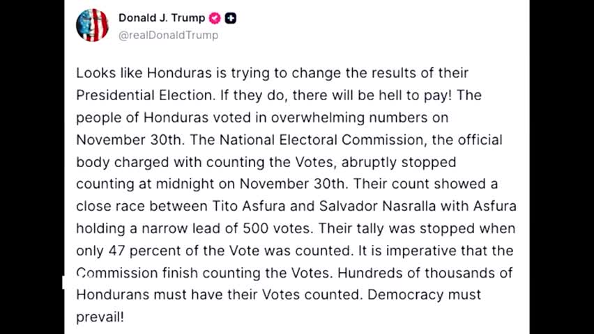 في رسالة عبر منصة "تروث سوشال"، ادّعى الرئيس الأميركي دونالد ترامب وقوع تزوير في انتخابات هندوراس، ملوّحاً بقطع المساعدات الأميركية إذا لم يفز مرشّح الحزب الوطني نصري آسفورا، ما أثار جدلاً واسعاً حول التدخل الخارجي في العملية الديمقراطية لهذا البلد.
