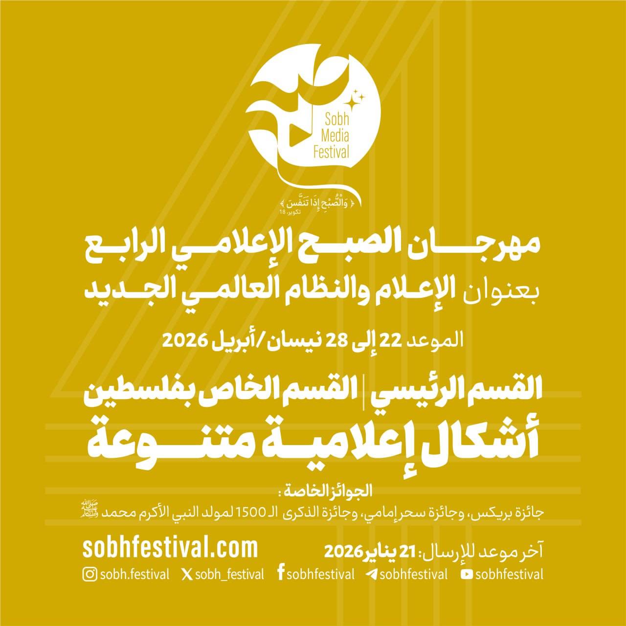 أعلن مهرجان «صبح» الإعلامي عن انطلاق دورته الرابعة تحت شعار «الإعلام والنظام العالمي الجديد»، داعياً المؤسسات والأفراد لتقديم أعمالهم حتى 21 يناير 2026.
